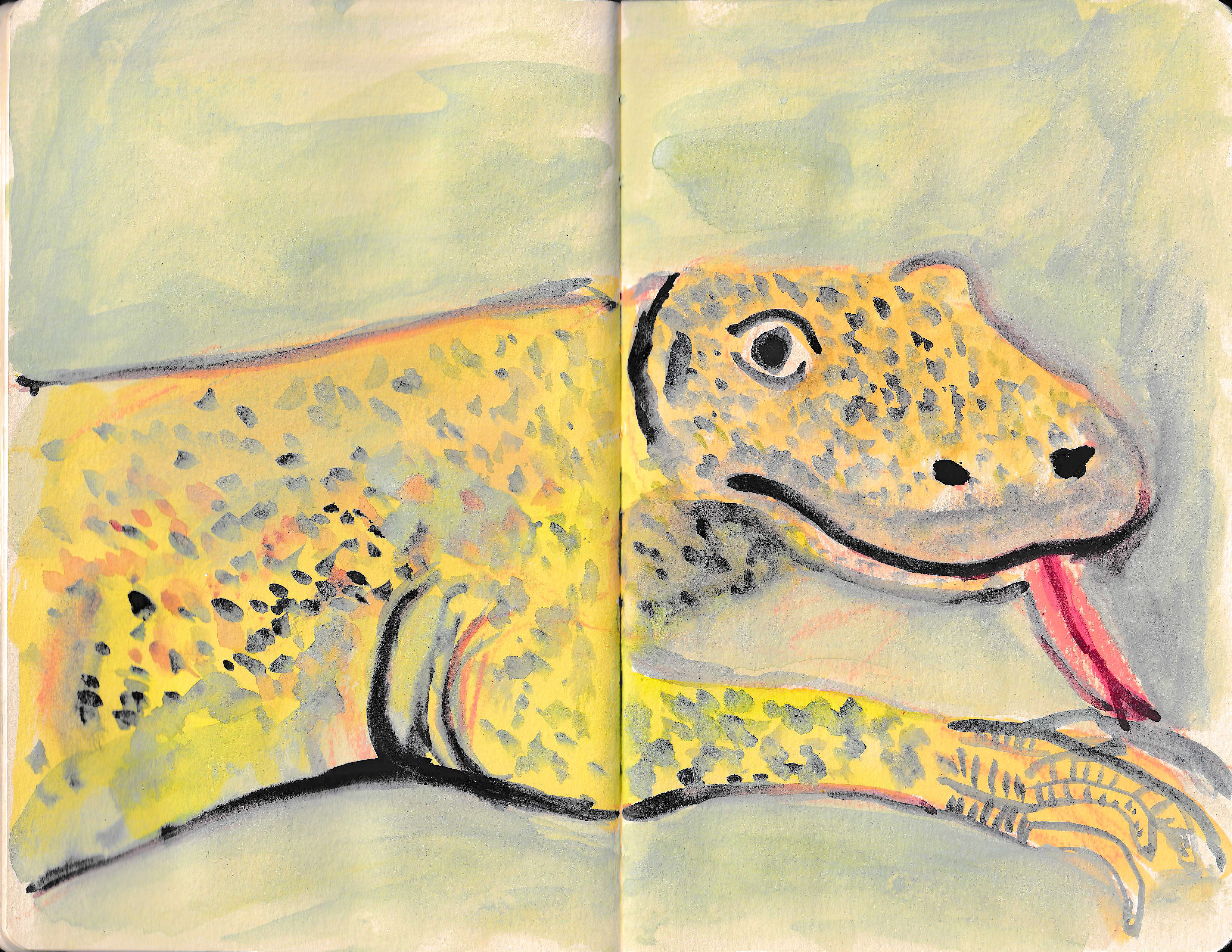 ’s beautiful self portrait unfold! I was amazed every time I looked up at the monitor, as I was painting Jeff, my favorite Komodo dragon.I used the Derwent Line & Wash Paint Set in a Canson Mixed Media Sketchbook.