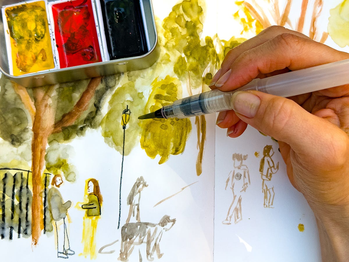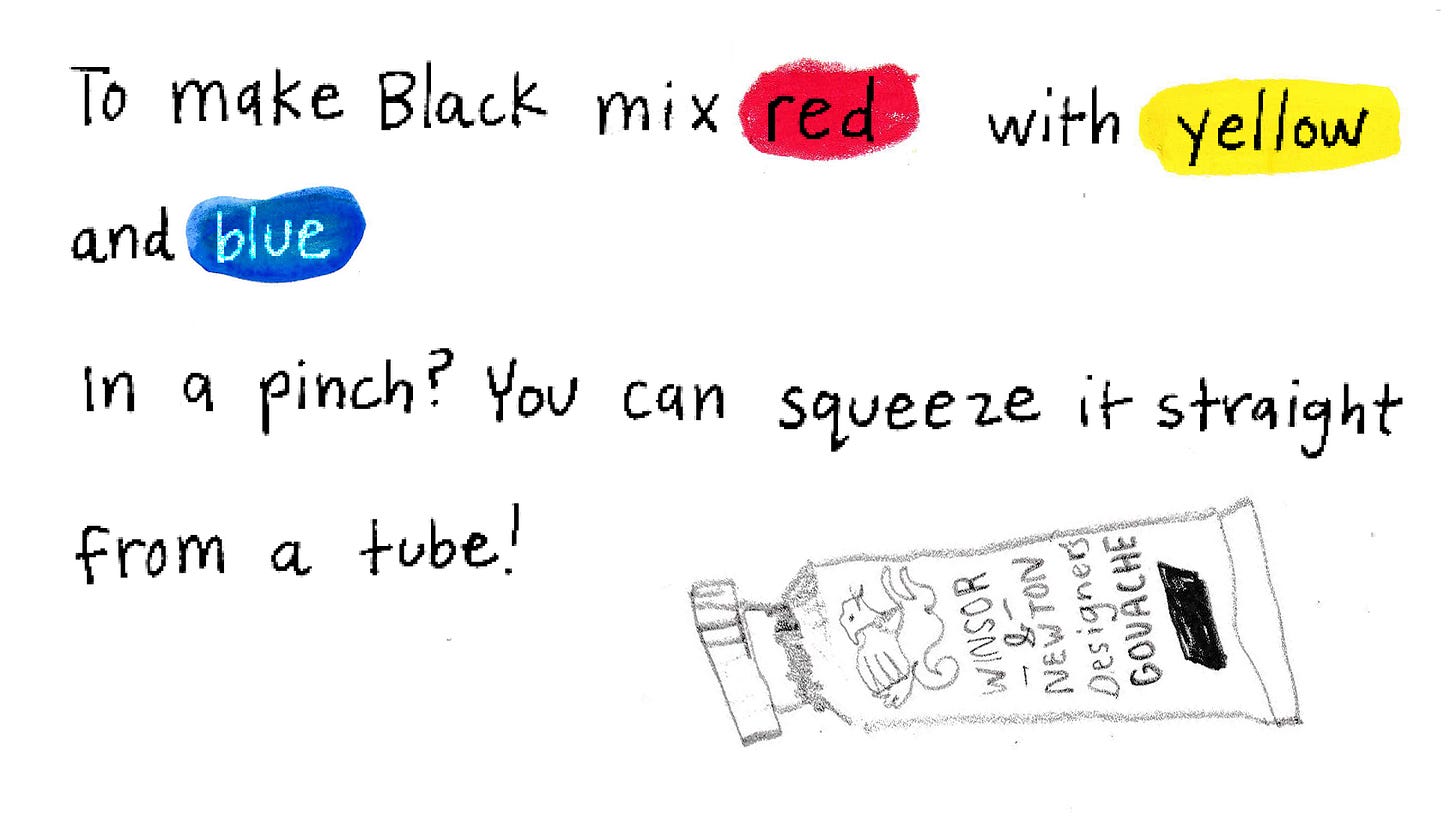I had a lovely time mixing indigo, red, and yellow ochre watercolor to create the most magical chromatic spots and details! Use red, yellow, and blue, or a pair of complementary colors and you can’t go wrong.