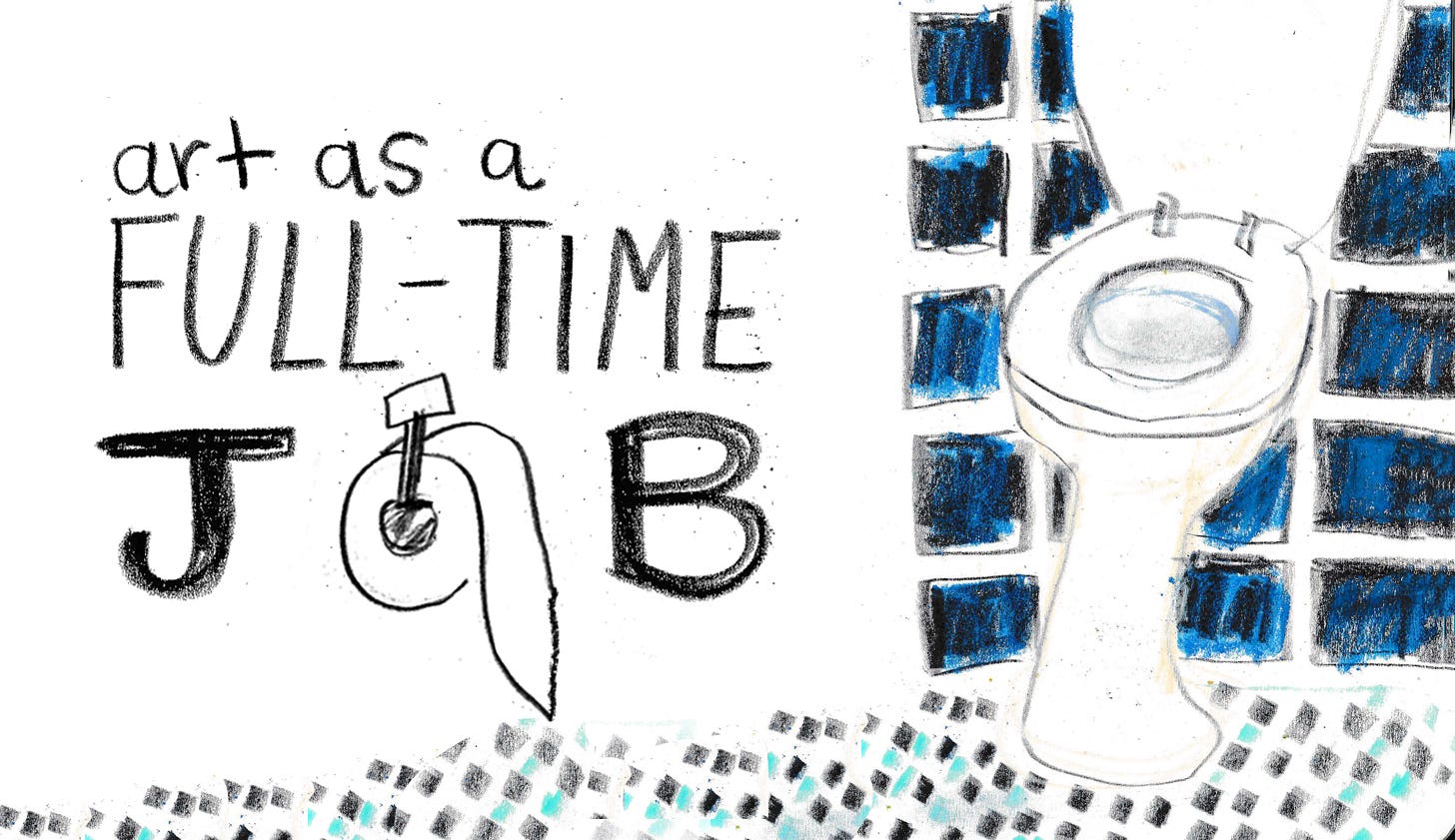 My first time on the full-time art career merry-go-round was selling at art markets and on Etsy. That quickly became exhausting, so I applied to that graphic design dream job and got hired. 3.5 years later, they had me scrubbing toilets.