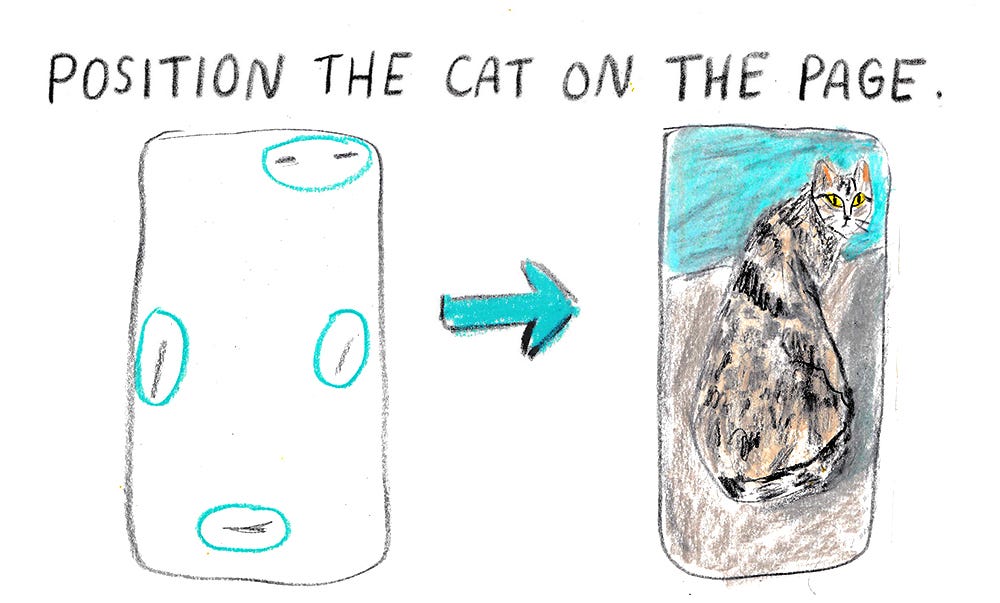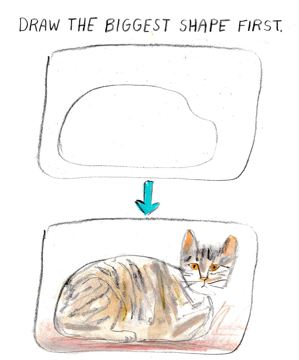 Before you draw, make marks to note where the top, sides, and bottom of the cat belong on the page. Accuracy isn’t important here, they’re simply for making sure you don’t leave out the tail or ear tip. You can erase over them later.